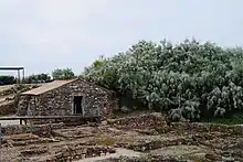 Los restos de las termas, excavadas al 1956, ocupan una área de 450 m².[9] Incluían un vestíbulo, frigidarium (tanque de agua fría), tepidarium (agua tibia), caldarium (agua caliente), con sistema de calentamiento subterráneo (hipocausto), además de piscinas y sala de gimnasia. En una de las piscinas hay restos de mosaicos.