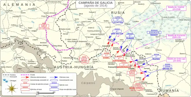 Los combates comenzaron cuando los ejércitos 4.º y 5.º rusos marcharon hacia el sur hacia la frontera y chocaron inesperadamente con el 1.er y 4.º ejércitos austrohúngaros, que avanzaban en sentido contrario.[83][84] Cada bando contaba con unos trescientos cincuenta mil hombres en este sector del frente.[83] Más al este, donde se encontraban el 3.er Ejército austrohúngaro y el 3.º y 8.º rusos,[85] estos contaban con gran superioridad numérica.[83] Sin embargo, el mando ruso esperaba que fuese en el este y no en el norte de la zona donde se concentrasen los austrohúngaros y no ordenó el inmediato ataque del 3.er y 8.º ejércitos, desperdiciando así su ventaja.[83] A pesar de los informes que indicaban que los austrohúngaros estaban reuniendo el grueso de sus unidades en el norte y de la petición del mando del 4.º Ejército de que se acelerase la ofensiva desde el este, Alekséyev lo descartó.[83] El propio jefe del 3.er Ejército, Nikolái Ruzski, que contaba con veintidós divisiones entre las suyas propias y las del 8.º frente a las nueve del enemigo, se comportó como si las expectativas rusas de una gran concentración de fuerza enemiga en el sector oriental del frente austrohúngaro fuesen correctas a pesar de los indicios que indicaban lo contrario.[86] Con una precaución innecesaria, avanzó lentamente y cruzó la frontera el 20 de agosto.[86] Como ya había sucedido en la campaña prusiana, la estructura de mando en el frente sur era deficiente: en el cuartel general del grupo de ejércitos Alekséyev se disputaba el mando efectivo con Ivánov, mientras que en el del 3.er Ejército, Ruzski —perteneciente a la camarilla del ministro de Defensa— mantenía tensas relaciones con su jefe del Estado Mayor, el general Dragomírov.[86] El 3.er Ejército finalmente entró en contacto con el enemigo no por propia iniciativa, sino porque los austrohúngaros finalmente lo acometieron el 26 de agosto.[86]
