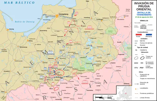 El plan ruso consistía en eliminar las fuerzas enemigas en Prusia Oriental mediante un movimiento de pinza, que debía llevar a cabo el 1.er Ejército desde el este y el 2.º de Samsónov desde el sur.[66] La maniobra dependía de la buena coordinación entre las dos unidades, ya que la gran separación entre ellas, casi cien kilómetros cuando llegasen a las principales defensas alemanas, podía permitir que las fuerzas enemigas se enfrentasen por separado a cada una de ellas si no era así.[66] Para evitar ataques en sus flancos, los mandos rusos debilitaron las columnas principales de los dos ejércitos para guardarlos y para evitar brechas entre ellos.[66] El 2.º Ejército empleó más de un cuerpo en proteger su flanco occidental y otro en evitar una posible brecha entre sus posiciones y las del 1.º.[66] Este retiró parte de sus fuerzas de la línea de ataque para cubrir su flanco derecho de un posible ataque desde la costa.[66] Así, la principal columna del 1.er Ejército quedó reducida a seis divisiones y media de infantería y el 2.º a nueve y media.[66] Las dos quedaban separadas por seis días de marcha y eran inferiores a las fuerzas que podían reunir los defensores alemanes: estos podían concentrar sus unidades contra uno de los brazos de la pinza rusa, derrotarlo y luego enfrentarse al otro.[66]