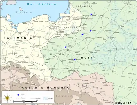 En octubre nueve divisiones rusas trataron de cruzar el Vístula frente a las cinco alemanas que intentaban impedírselo.[161] Los rusos no lograron cruzarlo Vístula y tuvieron que refugiarse en Varsovia, que Ludendorff no se atrevió a asaltar al hallarse en inferioridad numérica frente a los defensores.[162] Los Imperios Centrales planearon una añagaza: retirarían sus fuerzas del Vístula para atraer a los rusos y, una vez que estos estuviesen cruzando el río, se abatirían sobre ellos.[162] La maniobra, sin embargo, no salió según lo previsto por Ludendorff y Conrad: los rusos batieron a las unidades austrohúngaras frente a Ivángorod y pudieron cruzar el río.[162] En contra de los planes austro-germanos, el 22 de octubre diez divisiones rusas se enfrentaban a ocho de los imperios y la desventaja de estos aumentó pronto.[162] Ivánov había logrado que trece divisiones del 4.º y 9.º ejércitos cruzasen el río el 26 del mes.[162] Atacados en el flanco, los austrohúngaros perdieron cuarenta mil hombres y tuvieron que retroceder hacia el suroeste.[162] La retirada simultánea de Ludendorff,[94] de acuerdo al plan conjunto, hizo que los Imperios Centrales perdiesen todo el territorio conquistado a lo largo del mes anterior.[163]