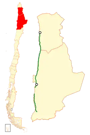 Recorrido: 144 km (km 410 a 266). En el área urbana sur de Iquique la ruta se denomina como Avenida Arturo Prat (km 410 al 406).[4]