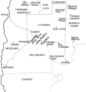 | • sur | Chelforó (39°5′14″S 66°30′50.8″O) | ||||||||