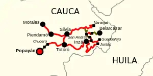 | Inzá | Río Sucio; Guanacas (Acceso a La Milagrosa); Inzá (Inicio 26CC07 hacia Alto de la Cruz, San isidro, El Rincón, Pedregal y Juntas (Cruce 3701 )); Crucero San Francisco (Acceso 26CC10 a Pedregal); Río Ullucos; El Hato; El Cruce (Inicio 26CC04 hacia San Andrés de Pisimbalá; Tumbichucué y Calderas). | ||