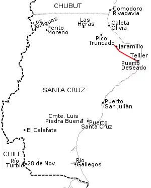 - Departamento Deseado: Puerto Deseado (kilómetro 0-2), Tellier (km 18) y Jaramillo (km 119).
