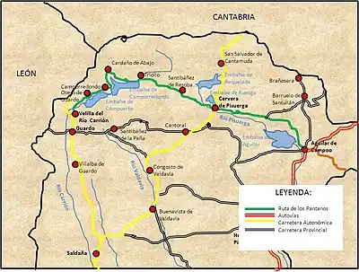 Atraviesa los embalses de esta comarca: en la vertiente del río Pisuerga, el Ruesga y de Requejada y en la vertiente del río Carrión: embalses de Camporredondo y Compuerto. Como complemento -aunque no se encuentra en la ruta- se puede visitar el Pantano de Aguilar, también en el cauce del Pisuerga.