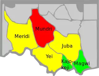 ![]() Mapa de los condados de Sudán del Sur afectados por la enfermedad del cabeceo en 2011. Varios de ellos se encuentran en el estado de Equatoria Central , en el sur del país, cerca de la frontera con Uganda; Juba en el Nilo Blanco es la capital del país. El distrito rojo ya se vio afectado en 2001, en los distritos amarillos la enfermedad prevaleció a partir de 2011 y en los distritos verdes sólo hay informes esporádicos.[1] | ||