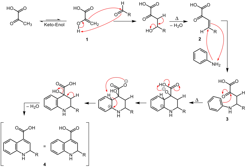 Aún falta concluir algunos detalles del mecanismo, sin embargo actualmente existen dos propuestas. La primera es una condensación aldólica entre el enolato del piruvato (1) y el aldehído, formando así un ácido α-cetocarboxílico β,γ-insaturado (2). La segunda reacción es una adición de Michael con anilina para formar el aducto (3). Después de la ciclización en el anillo de benceno y dos intercambios protónicos, el ácido 4-quinolincarboxílico (4) se forma por deshidratación:[3]