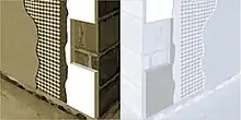 - Imprimación y acabado mediante revoques estructurados desde 1mm a 3mm en el color elegido. Revoques de silicato, resina sintética, acrílica, de silicona(con nanotecnología), etc. Debido a que el aislamiento térmico posterior evita la difusión del calor la energía del sol incidente sobre los aproximadamente 3 mm de concreto armado con malla de fibra de vidrio puede alcanzar temperaturas de hasta 80 °C. Es importante utilizar terminaciones claras o productos desarrollados por la NASA para el transbordador espacial como el "Super Therm" [1] a base de micro-esferas cerámicas.