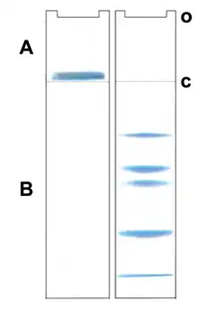 El gel formado a partir de este material también puede resistir gradientes de alto voltaje, ser viable para varios procedimientos de tinción y destinción y puede ser digerido para extraer fracciones separadas o desecado para su autorradiografía y registro permanente. La electroforesis en disco utiliza geles de distintos tamaños de poro.[7][8] El nombre de electroforesis en disco deriva del acrónimo inglés DISC, que hace referencia a las discontinuidades en la matriz electroforética y por coincidencia a la forma discoidal de las zonas separadas de iones. Hay dos capas de gel, el gel de apilamiento o espaciador y el gel de resolución o separador.
