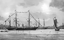 Tripulación 220 hombres maquinaria Caldera máquina 4 troncos 2 máquinas de vapor oscilantes de 2 cilindros Maquinaria- potencia 1.800 hp (1.324 kW) máximo velocidad 11,6 nudos (21 km/h) Hélice 2 ruedas de paletas ⌀ 7,75 m aparejo y aparejo Barca de aparejo Número de polos 3 Superficie vélica 1.620 m² armamento 12 cañones de bomba de 68 libras