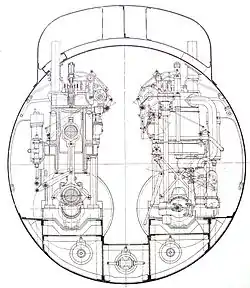 Sección del casco de un submarino con un doble motor diésel Germaniawerft-Zweitakt (1904)