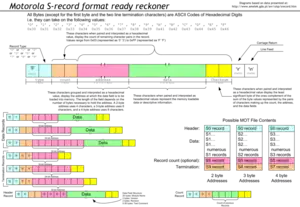 El formato Motorola S-record codifica datos binarios en texto ASCII. Sus ventajas sobre un archivo binario son su facilidad de edición con un editor de texto y la presencia de una suma de verificación para detectar archivos corruptos.[1] El formato de archivo también se conoce como SRECORD, SREC, S19, S28 o S37.