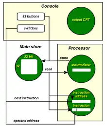 A pesar de que los primeros computadores, como el CSIRAC, usaron con éxito la memoria de línea de retardo de mercurio,[17] esta tecnología tenía varios inconvenientes: la cantidad de datos que podían almacenar eran limitados, era pesado y caro. Además, ya que los datos se almacenaban como una secuencia de ondas acústicas propagadas a través de una columna de mercurio, la temperatura del dispositivo debía ser controlada muy cuidadosamente ya que la velocidad del sonido a través de un medio varía con la temperatura. Frederic C. Williams había presenciado un experimento en los Laboratorios Bell que demostró la efectividad de los tubos de rayos catódicos (CRT) como una alternativa al retraso de tiempo para remover los ecos del terreno en las señales de radar. Mientras trabajaba en el Establecimiento de Investigación de Telecomunicaciones (Telecommunications Research Establishment, TRE), poco antes de incorporarse a la Universidad de Mánchester en diciembre de 1946, desarrolló una forma de memoria electrónica usando un CRT que se conoció como el "Tubo Williams".[18] La "Máquina Experimental de Pequeña Escala de Mánchester" (Manchester Small-Scale Experimental Machine, SSEM) fue diseñada para probar los tubos Williams, el primer dispositivo de almacenamiento digital de acceso aleatorio, que podía trabajar a la velocidad de la computadora.[19]