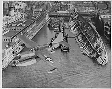 El Lafayette comenzó a inundarse por el agua vertida por los bomberos para sofocar el fuego, y el barco comenzó a escorarse peligrosamente hacia babor debido al agua bombeada hacia el interior. El diseñador del barco, Vladimir Yourkevitch, llegó a la escena del desastre para intentar dar apoyo técnico y ofrecer su experiencia al equipo de bomberos.[46][61] Sugirió acceder al barco y abrir las válvulas inferiores. Esto inundaría las cubiertas más bajas y permitiría al barco asentarse sobre el fondo del muelle. Con el barco estabilizado, el agua podría ser bombeada hacia el interior, a las áreas en llamas, sin riesgo de que pudiera zozobrar. La sugerencia técnica fue rehusada por el comandante del 3.º Distrito Naval, el contralmirante Adolphus Andrews, y Yourkevitch fue apartado a la fuerza del lugar por la policía.[46][61]