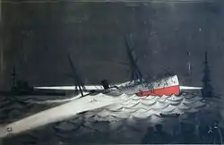 ![]() Dibujo del hundimiento del Utopia realizado por una testigo, la Sra. Georgina Smith. | ||
