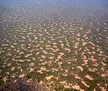 Como contraste, las áreas entre estas plantas más grandes contienen una gran porción de tierra desnuda con plantas herbáceas. La costra del suelo, endurecida, dificulta la infiltración.
