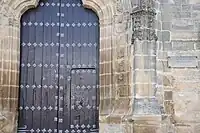En la parte superior de la fachada norte se encuentran los escudos de armas de Alonso Suárez de la Fuente del Sauce, obispo de Jaén de la época. Es una fachada de estilo gótico flamígero, frente al estilo plateresco de la fachada sur conocida como del Sol de Mediodía.