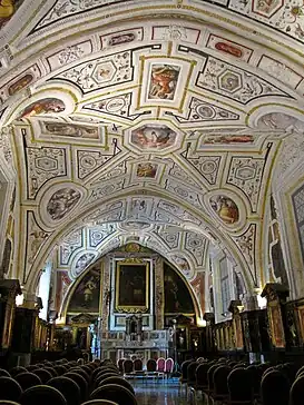 La bóveda de la nave central está dividida en tres cuadrantes, que muestran personificaciones de la Fe, la Religión y la Eternidad.[3][4] A lo largo de las paredes hay un mobiliario del siglo XVII decorado con un ciclo de preciosas incrustaciones de madera de Fra Giovanni da Verona que data de 1506 (el tercer ciclo después de los de Santa Maria in Organo en Verona y la Abadía Territorial de Monte Oliveto Maggiore cerca de Asciano) con vistas de la ciudad y escenas de la vida en la orden olivetana. Entre las incrustaciones hay nichos con estatuas de madera que representan a santos relacionados con los olivetanos. Detrás del altar hay un cuadro de Carlo Borromeo, obra de Girolamo d'Arena, que había colgado en la iglesia original de Sant'Anna dei Lombardi (que también había sido dedicada a San Carlo Borromeo), pero que fue trasladado a su ubicación actual después de que esa iglesia fuera destruida en el terremoto de 1805. A ambos lados hay dos pinturas de Miguel Arcángel y la Virgen María.