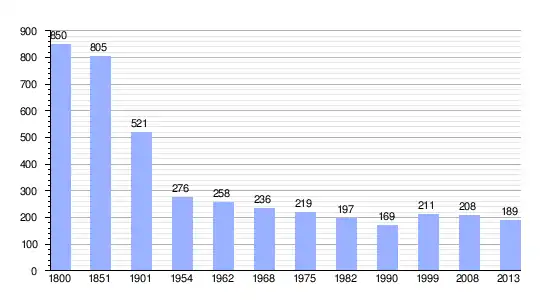 Los datos demográficos contemplados en este gráfico de la comuna de Sacy[4] se han cogido de 1800 a 1999 de la página francesa EHESS/Cassini, y los demás datos de la página del INSEE.[5]