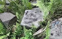 Los tres bloques que formaban la entrada, cada uno de unos 2 metros de largo y medio metro de circunferencia, y los bloques de la pared eran de granito porfirítico rojo, de dureza adamantina. Había otra puerta en la esquina sureste, que conducía al arroyo, en el que se encuentran varios bloques lisos y tallados de granito y arenisca.[15]