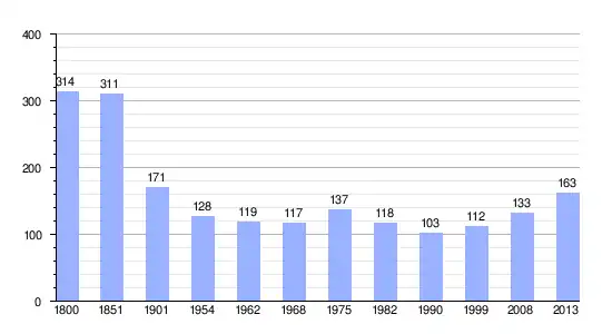 Los datos demográficos contemplados en este gráfico de la comuna deSaint-Aubin-des-Hayes[4] se han cogido de 1800 a 1999 de la página francesa EHESS/Cassini, y los demás datos de la página del INSEE.[5]