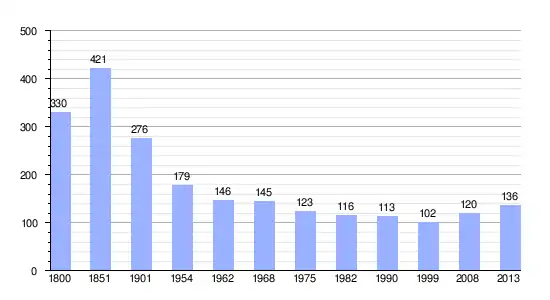 Los datos demográficos contemplados en este gráfico de la comuna de Saint-Bois[4] se han cogido de 1800 a 1999 de la página francesa EHESS/Cassini, y los demás datos de la página del INSEE.[5]