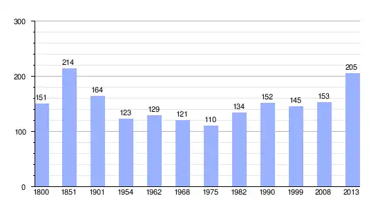 Los datos demográficos contemplados en este gráfico de la comuna de Saint-Denis-du-Béhélan[4] se han cogido de 1800 a 1999 de la página francesa EHESS/Cassini, y los demás datos de la página del INSEE.[5]