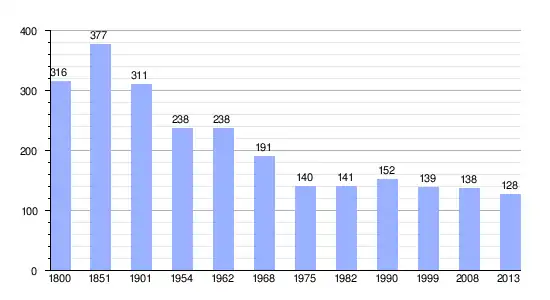 Los datos demográficos contemplados en este gráfico de la comuna de Saint-Denis-sur-Ouanne[4] se han cogido de 1800 a 1999 de la página francesa EHESS/Cassini, y los demás datos de la página del INSEE.[5]