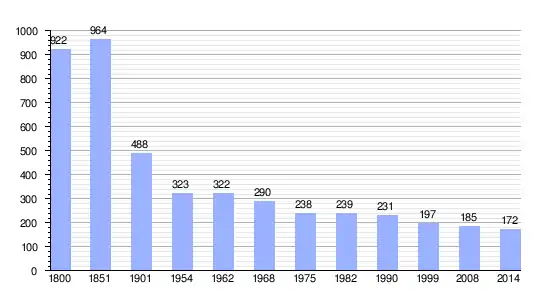 Los datos demográficos contemplados en este gráfico de la comuna de Saint-Jean-des-Bois[4] se han cogido de 1800 a 1999 de la página francesa EHESS/Cassini, y los demás datos de la página del INSEE.[5]