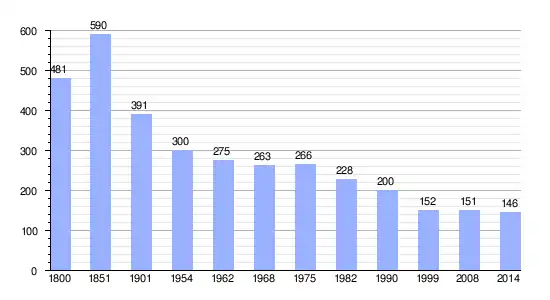 Los datos demográficos contemplados en este gráfico de la comuna de Saint-Symphorien-des-Monts[4] se han cogido de 1800 a 1999 de la página francesa EHESS/Cassini, y los demás datos de la página del INSEE.[5]