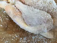 La carne generalmente se remoja en agua fría y se escurre para luego cubrirla completamente con una fina capa de sal, y luego se deja reposar en una rejilla o tabla durante una hora o más. Los gránulos de sal más grandes permanecen en la superficie de la carne, en su mayor parte sin disolver, y absorben los fluidos de la carne, que luego se reabsorben parcialmente junto con la sal y los condimentos agregados, esencialmente salando la carne en sus propios jugos. Después la mezcla de sal se enjuaga y se desecha antes de cocinar la carne.[13][12]