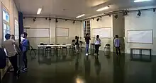 En un principio se prevía dotar al centro de una sala principal y una sala de ensayos, cambiando el uso de la antigua sala teatral de la cooperativa de la planta principal por sala de ensayo y bajando -tal y como al final ha ocurrido- la actividad teatral a pie de calle en la zona de la piscina de la sauna, hecho que permite ahora el acceso directo de los decorados. Sin embargo al decidir bajar el bar se optó porque el antiguo bar fuera la sala de ensayos y se mantuviera la actividad teatral en la planta principal como sala secundaria con 100 localidades. Para adecuarse a las nuevas normativas se prescindió de la mayor parte de la estructura de madera del antiguo escenario elevado, renovando suelo y techo y dejando toda la nueva sala a mismo nivel. Sin embargo, a diferencia de la sala inferior, ésta sala se ha mantenido el color y estado envejecido de las paredes, así como la embocadura, permitiendo así la posibilidad de integrar o anular según la disposición de las graderías la arquitectura existente en la producción teatral siguiendo los postulados de Peter Brook.