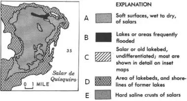 ![]() A) superficie blanda, de húmeda a seca, B) área normalmente bajo el agua, C) Salar o antiguo lecho de un lago, D) lecho de un antiguo lago, E) costra dura de un salar. | ||