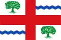 - Bandera rectangular de proporciones 2:3 formada por un paño blanco con una cruz completa roja centrada teniendo en el cantón superior del asta y en el inferior del batiente una encina verde arrancada y en los otros dos una franja ondada azul horizontal y centrada.