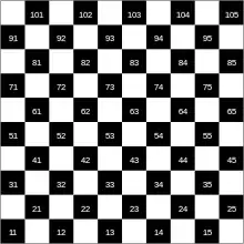La posición del tablero es la misma que la del ajedrez, es decir, cada ficha tiene un espacio en blanco a su derecha. Sin embargo, la designación de las celdas es diferente: dado que las fichas solo se mueven por las casillas negras, solo se les asigna un número a estas. Así, se van numerando línea por línea del 11 al 15, del 21 al 25, etc., hasta la última línea, que es numerada del 101 al 105.[3]