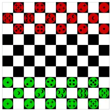 - Las piezas se colocan inicialmente en las tres primeras filas de cada jugador, tal como se describe en la sección anterior.