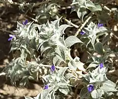 Este arbusto produce muchas ramas revestidas de fibras de lana blanca y puede exceder de un metro de altura. Las hojas se inclinan con espinas. Las flores se producen en grupos de tres en cada axila de la hoja. La corola es tubular de color púrpura o azul y mide entre uno y dos centímetros de largo y están rodeados por los cálices de sépalos con espinas. Está estrechamente relacionado con Salvia greatae.[1]