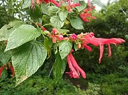 Salvia sessei es un arbusto de hasta 4 m de alto, de fuste leñoso de unos 3.5 cm de diámetro. Las hojas son pecioladas, ovado-oblongas, glabras en el haz y pubescentes en el envés, de 4 a 12 cm de largo y 1.6 a 8 cm de ancho, ápice acuminado, margen aserrado en la mitad superior y entero en la mitad inferior. La inflorescencia es una címula reducida de una flor bilabiada grande de color rojo brillante, agrupada en verticilastros de dos flores, estos a su vez agrupados en panículas. El cáliz es inflado-campanulado, glabro, membranáceo, del mismo color que las flores (opaco con la edad). El fruto es una núcula encerrada en el cáliz.[1][2][3]