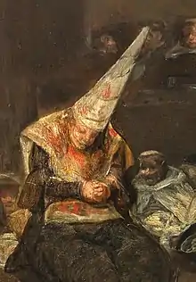 El sambenito era una prenda utilizada originalmente por los penitentes católicos para mostrar público arrepentimiento por sus pecados, y más adelante por la Inquisición española para señalar a los condenados por el tribunal, por lo que se convirtió en símbolo de la infamia.