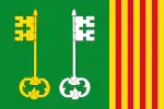 Escudo embaldosado cortado: primero de sinople, con dos llaves en palo con los dientes arriba y adosadas, la de la diestra de oro y la de la siniestra de argén; segundo de oro, cuatro palos de gules. Por timbre una corona mural de villa.[7]