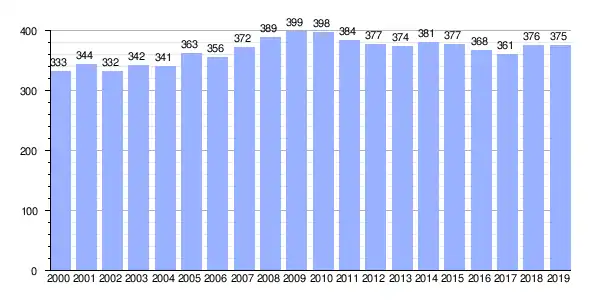 Gráfica de evolución demográfica de Trobe (aldea) entre 2000 y 2019