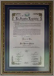- Sanchez Hernandez (5 de diciembre de 1963). «Acuerdo Nº 2815». Diario Oficial (Tomo 201 Número 240) (San Salvador). p. 12153. Consultado el 27 de marzo de 2019.