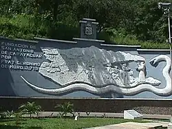![]() Entrada del pueblo, viniendo desde Maturín. El mural, obra de una artista local, recuerda la fundación del pueblo por Fray Gerónimo de Muros y hace alusión a la leyenda de la culebra de Ipure.
