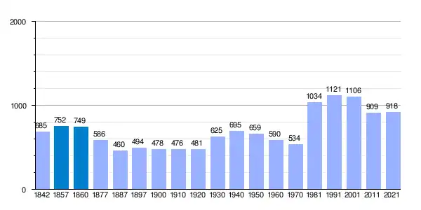 | Gráfica de evolución demográfica de Sant Bartomeu del Grau[5] entre 1842 y 2021 |