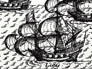 El San Buena Ventura fue construido tomando como modelo el Liefde (representado aquí), el barco en el cual William Adams llegó a Japón.