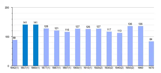 | Gráfica de evolución demográfica de San Cristóbal de Trabancos[5] entre 1842(1) y 1970 |