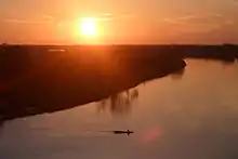 La franja central muestra la riqueza hídrica, ciénagas, lagunas, caños, humedales y hermosos paisajes. El río es la principal arteria que irriga y da subsistencia a los pobladores. Y el pescador usando su atarraya, reafirmando la supervivencia del hombre anfibio. Y su eterna acompañante, la canoa, su versátil medio de transporte. Por último la franja inferior, sobre fondo rojo, vemos el mapa o delineamiento del municipio, una corona de oro con piedras preciosas y un cetro alusivas a su patrono San Fernando Rey.