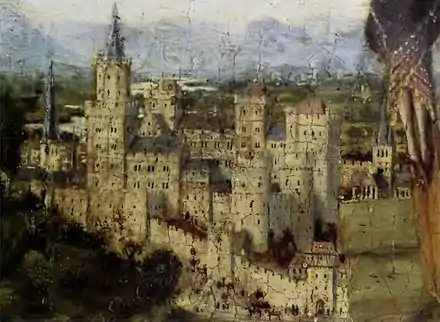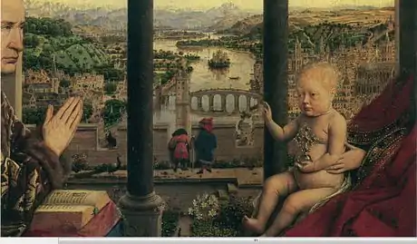 El marrón de las rocas y los árboles hace eco en los de las túnicas de los santos. La amplitud de las montañas y la ciudad aísla a las figuras contra la grandeza de la naturaleza y el bullicio de la vida humana. Detrás de las figuras un paisaje de montaña panorámico se eleva hacia el cielo; el plano medio contiene una variedad de rocas y picos, incluyendo estratos de capas fosilíferas. Como en la Crucifixion y Juicio Final de Nueva York, las montañas están cubiertas de nieve, lo que van Eyck pudo haber visto durante sus visitas a Italia y España, donde cruzó los Alpes y los Pirineos.