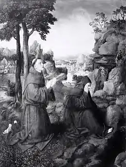 San Francisco vivió austeramente, a imitación de Cristo. Abrazó el mundo natural, e hizo votos de pobreza, caridad y castidad. En 1224 en La Verna, experimentó la visión mística que van Eyck retrata. Tomás de Celano, autor de la hagiografía de Francisco, describe la visión y estigmatización: "Francisco tuvo una visión en que veía un hombre como un serafín: tenía seis alas y estaba de pie sobre él con las manos extendidas y sus pies atados juntos, y estaba fijado a una cruz. Dos alas se levantaban por encima de su cabeza, dos estaban extendidas a punto para el vuelo, y dos cubrían su cuerpo entero. Cuando Francisco vio esto estaba absolutamente asombrado. Pero no comprendía lo que esta visión podría significar." Mientras meditaba, "comenzaron a aparecer marcas de uñas en sus manos y pies ... Sus manos y pies parecían ser agujereados por uñas apareciendo en el interior de sus manos y la parte superior de sus pies ... Su costado derecho se desgarró como si hubiera sido agujereado por una lanza, y con frecuencia se filtraba sangre." Para el observador medieval, el aspecto de los estigmas significaba la absorción completa de Francisco en la visión del serafín.