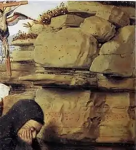 El meticuloso escenario y el paisaje fueron otra innovación en la iconografía. Generalmente La Verna era descrita con escaso detalle, mientras que aquí San Francisco se arrodilla en un campo detallado, quizás un sitio concreto en la propia La Verna en los Apeninos italianos, donde se encuentra esta arenisca estriada, y que el artista pudo ver en su viaje a Italia. El encuadre es apropiadamente remoto. Francisco parece mirar más allá de las rocas, según parece no afectado, un dispositivo eyckiano para ilustrar una visión mística. Por ejemplo, en su Virgen del Canciller Rolin es difícil decir si la ubicación es la sala del trono de María o si es meramente una aparición en la habitación de Rolin, que él mira con similar impasibilidad.